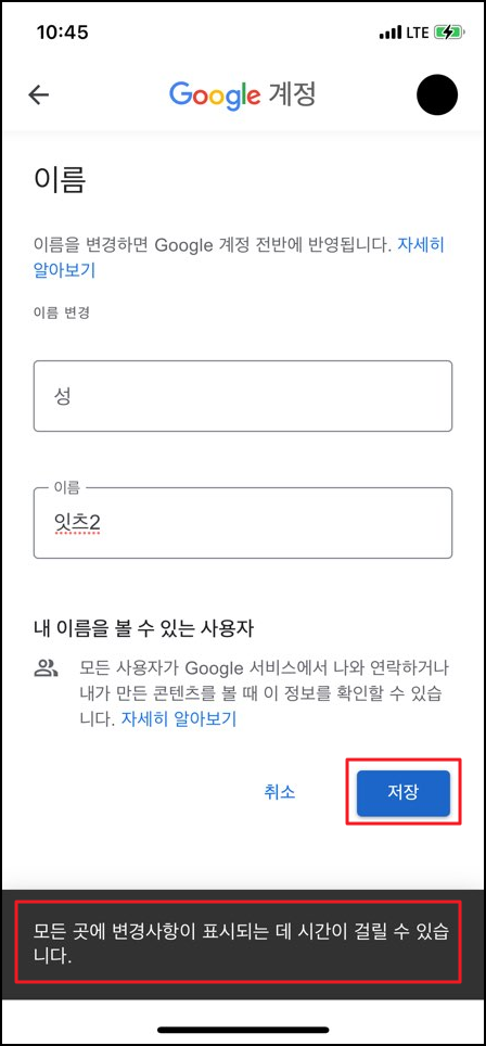 저장을 누르면 화면 아래쪽에 '모든 곳에 변경사항이 표시되는 데 시간이 걸릴 수 있습니다.' 라는 문구가 나옵니다.