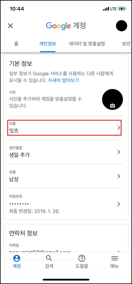 새로운 화면이 생성되었습니다. 여기서 '개인정보'를 눌러주세요!! 개인정보를 눌러주면 자신이 Google 계정을 만들때 설정한 기본정보들이 기입되어 있습니다.