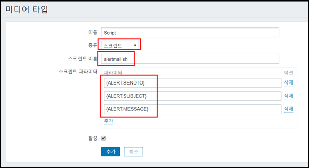 - 스크립트 파라미터 부분은 스크립트 실행시 [수신처], [제목], [본문] 을 인자로 넘김니다. 그림과 같이 설정해주세요.