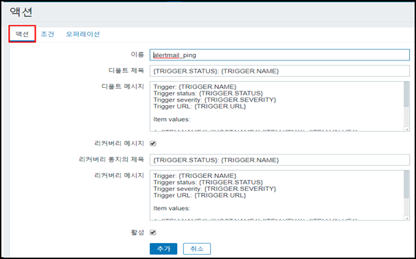 - 트리거 발생 시 처리할 액션을 지정합니다. 여기서 액션이란 Mail, SMS 등의 방법으로 알람을 사용자가 전달받을 수 있는 기능을 말합니다.