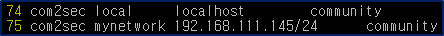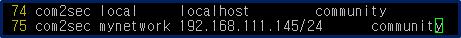 - 설치가 완료되면 /etc/snmp/snmpd.conf 경로의 설정 파일을 찾아 아래와 같이 변경한다. 단 75 line 의 IP주소는 자신의 서버주소를 입력한다. Cacti 설치에 나온 방법과 동일하기 때문에 어렵지 않게 설정할 수 있다. 모든 설정이 끝나면 snmpd 를 재시작 한다.