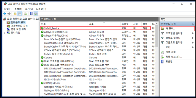 - SNMP Service 등록이 끝나면 제어판에서 [windows 방화벽] 설정 탭에 접속하여 [고급 설정]을 클릭한다. 여기서 [인바운드 규칙] 을 클릭하고 오른쪽 상단에 [새 규칙] 을 클릭하여 TCP Port 161 번을 모두 허용으로 변경하여 새로운 규칙을 생성한다.