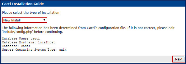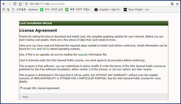 - 위 그림의 내용은 cacti 설치후 처음으로 웹 접속 페이지이며, 아파치 설정의 홈 경로와 cacti 설정을 통해 위와 같은 웹 페이지 접속이 가능하다. 그 다음 Next를 눌러 다음으로 진행하면 된다.
