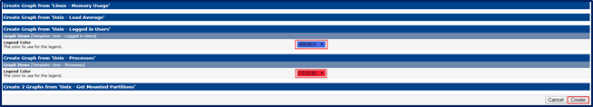 - Host 부분을 보면 자신이 등록한 서버를 선택할 수 있다. 이 부분을 먼저 선택 한 다음 새로 생성하고 싶은 그래프의 항목을 체크하고 Create를 누르면 된다.
