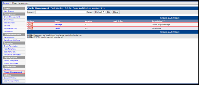 - 설치가 완료된 상태에서 https:// [your IP address] /Cacti 로 접속하여 새로 생성된 plugin management 를 클릭한다. Settings 플러그인을 disable (↓) 에서 enable (↑) 상태로 변경한다.
