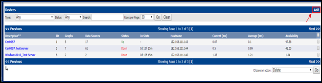 - 기존에 cacti 를 구성한 192.168.111.143/cacti 에 접속하여 모음에서 Management -> Devices 탭을 클릭한다. Device 부분의 왼쪽 상단에 Add를 클릭하면 새로운 Device를 등록할 수 있다.