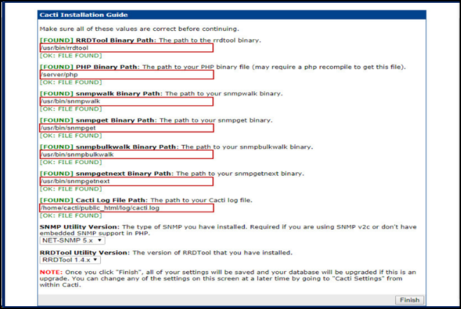 - 해당 경로가 다를 경우 [FOUND] 표시가 [Not FOUND] 로 표시된다. 만약 경로를 정확하게 지정하지 않고 다음 페이지로 넘어가는 경우에 cacti 사용이 불가능하다.