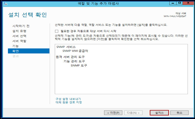 - 서버의 Windows 키를 눌러 [서버 관리자] 를 실행한다. 오른쪽 상단에 [역할 및 기능 추가 마법사] 를 실행한다. 기능 선택에서 [시작하기 전] -> [설치 유형] -> [서버 선택] -> [서버 역할] 모두 다음을 클릭한다. [기능] 부분에서 [SNMP 서비스], [SNMP WMI 공급자] 를 모두 선택하여 설치를 진행한다.