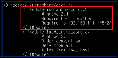 - 마지막으로 /etc/httpd/conf.d/cacti.conf 의 설정 파일을 수정해준다.