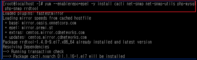 - 해당 명령어를 입력한 뒤에 cacti, rrdtool, snmp 를 설치한다.