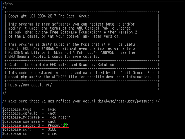 - mysql에서 생성한 cacti 접근 권한 계정을 /usr/share/cacti/include/config.php 파일의 경로를 찾아 username과 Password를 자신이 등록한 계정으로 수정해준다.