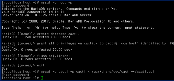 - Cacti 계정 생성이 끝나면 sql 설정 파일을 cacti 데이터베이스에 넣어준다.
