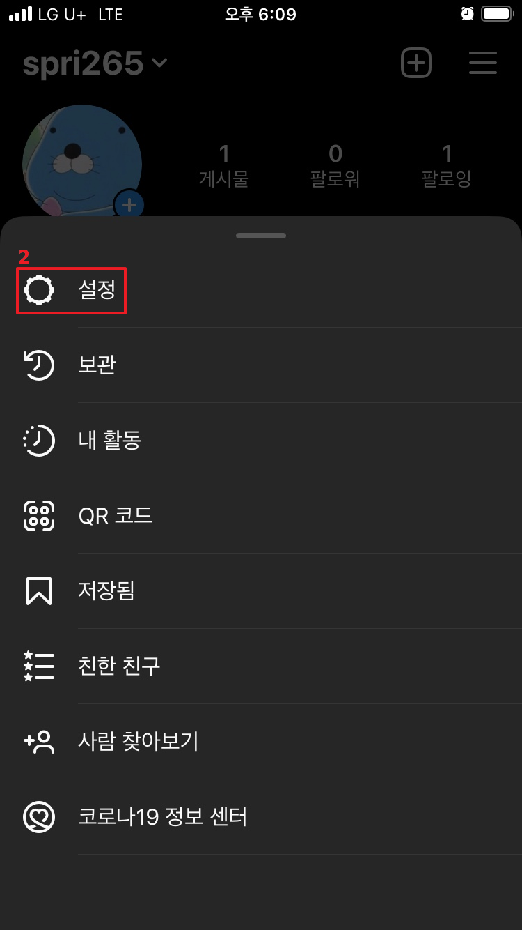 두 번째로 메뉴창이 활성화되면 설정을 누릅니다.