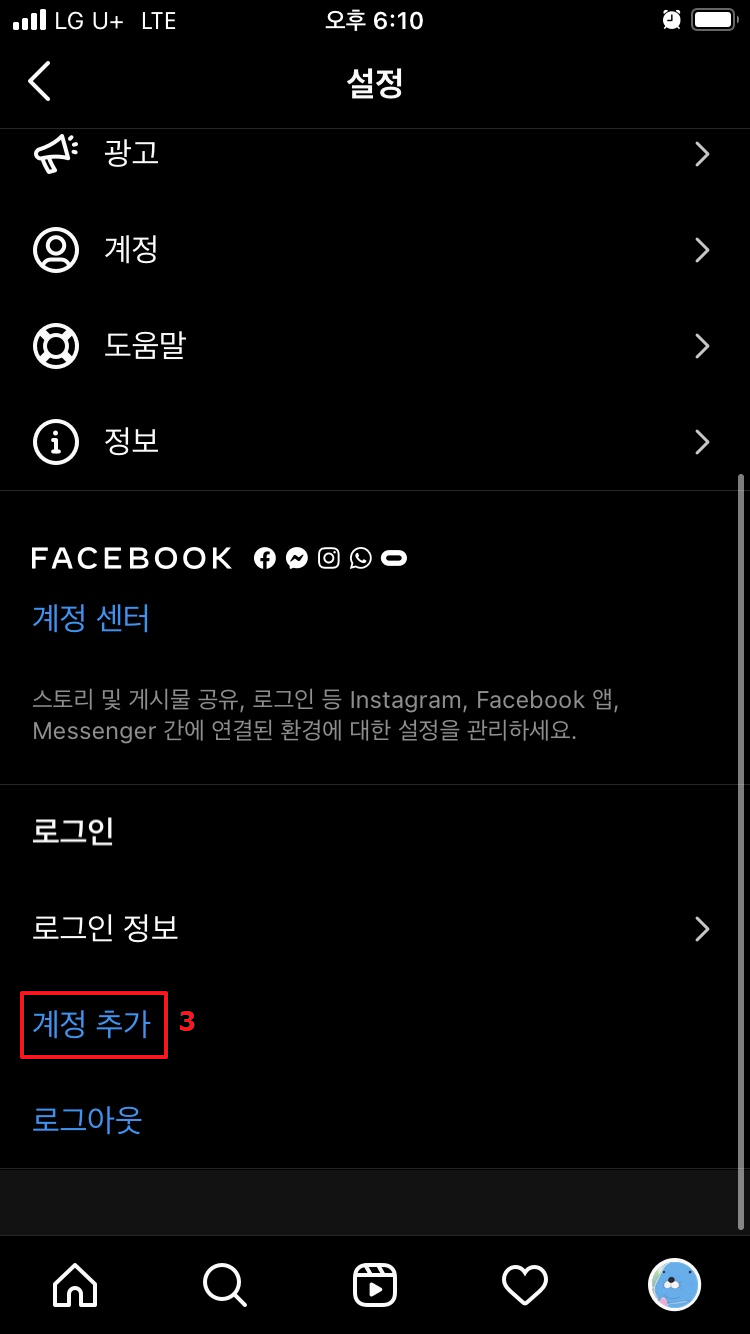 첫 번째는 자신의 프로필 사진에 + 버튼을 눌러서 계정을 추가하는 방법