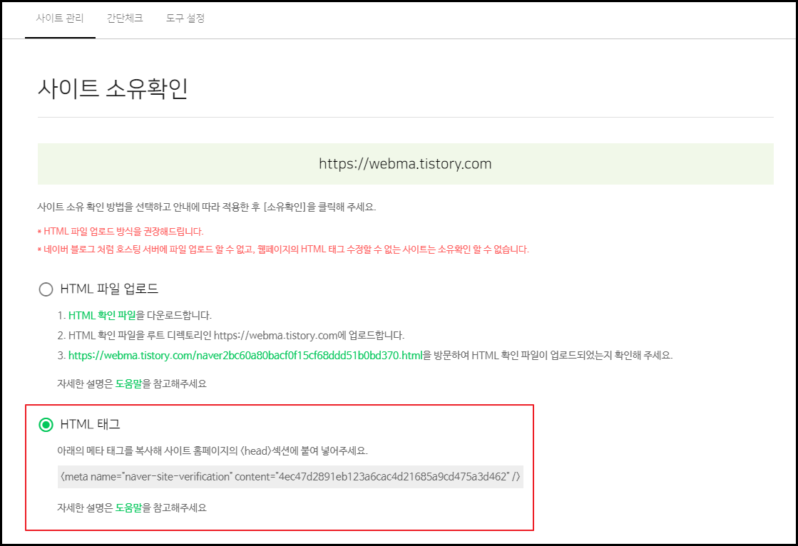 사이트 등록이 완료되면 네이버에서 사이트 소유를 확인하기 위해 두 가지 방법을 안내합니다.
