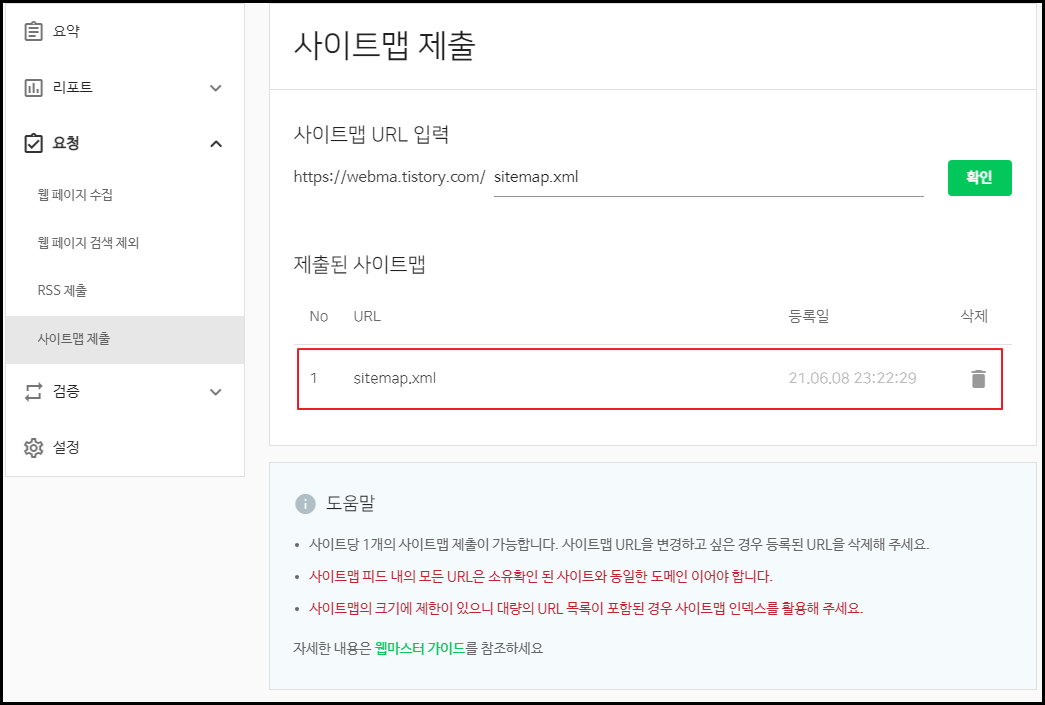 복사한 sitemap.xml 을 네이버 웹마스터도구 [요청] -> [사이트맵 제출] 로 들어가 붙여넣기 후 확인을 눌러주세요. 확인을 누르면 아래 사진과 같이 '제출된 사이트맵'에 URL 주소가 등록됩니다.