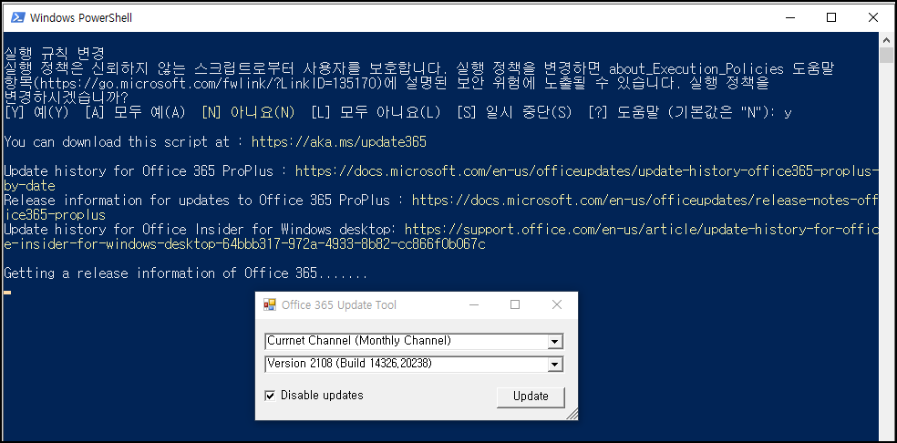 - 아래 화면과 같이 Update Tool 이 실행되면 'Current Channel (Monthly Channel)', 'Version 2108 (Build 14326.20238)' 항목을 선택합니다.