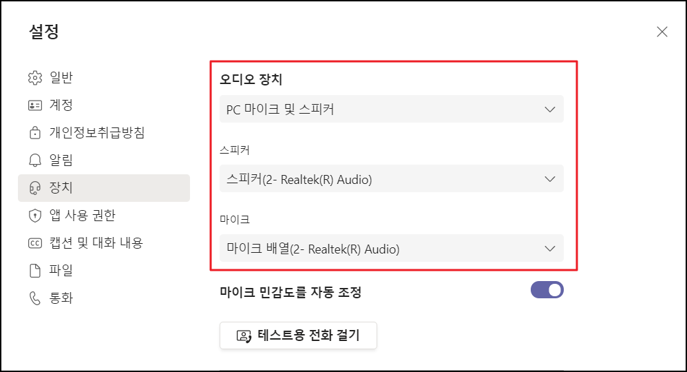 - '장치' 탭을 클릭하고 마이크 설정 확인을 위해 노트북에 탑재된 스피커, 마이크를 확인합니다.